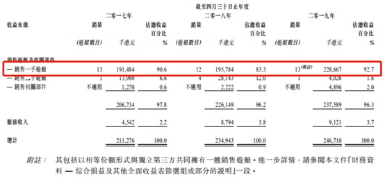 于往绩期间,公司的收益主要来自销售一手游艇,于2017财政年度、2018财政年度及2019财政年度,收益分别为191.5百万港元、195.8百万港元及228.7百万港元,分别占总收益的90.6%、83.3%、92.7%。