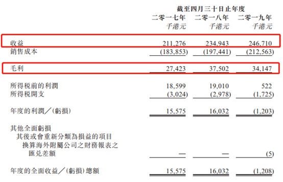 于2017财政年度、2018财政年度及2019财政年度,公司的总收益分别为约211.3百万港元、234.9百万港元及246.7百万港元;毛利分别为27.4百万港元、37.5百万港元及34.1百万港元。