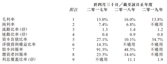 于2017年、2018年及2019年四月三十日,资本负债比率分别为约27.1%、10.1%及34.7%。资本负债比率由2017年四月三十日的约27.1%下跌至2018年四月三十日的约10.1%,主要由于以下各项的综合影响所致:(i)纯利由2017财政年度的约15.6百万港元增加至2018财政年度的约16.0百万港元,导致于相关日期的总权益结馀有所增加;及(ii)于相关日期的应付董事款项减少约1.3百万港元。2019年四月三十日的资本负债比率上升,乃主要由于2019财政年度的可换股债券增加约7.8百万港元所致。