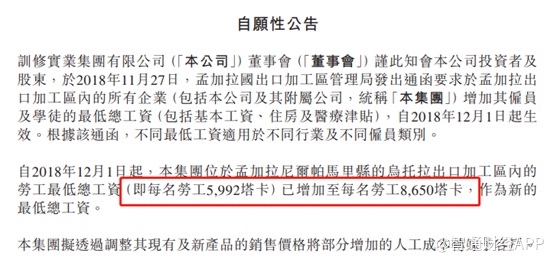 智通财经APP观察到,2018年12月27日,训修实业发布一份自愿性公告。公告显示,从2018年12月1日起,集团位于孟加拉乌托拉出口加工区的劳工最低工资从5992塔卡增加至8650塔卡,增幅44.4%,而一般情况下,这个增幅稳定在10%左右。