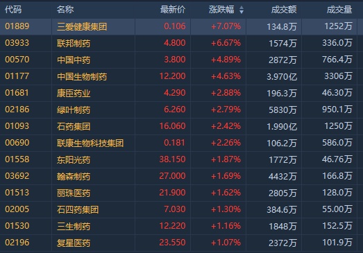 智通财经APP获悉,近期药品行业频出利好政策,且适逢市场环境较为弱势,市场资金有避险需求,因而抱团流入药品板块。今日药品板块集体逆市上扬。截至发稿,联邦制药(01889)涨6.89%,报4.81港元;中国中药(00570)涨4.89%,报3.8港元;中生制药(01177)涨4.8%,报12.22港元;绿叶制药(02186)涨2.46%,报6.24港元;石药集团(01093)涨2.55%,报16.08港元。