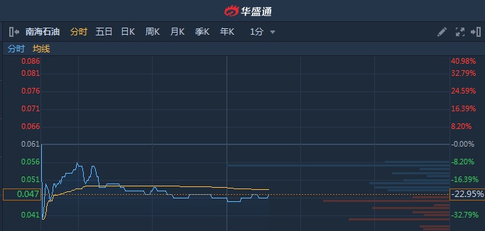 智通财经APP获悉,南海石油(00076)中期股东应占溢利同比降98.75%至19.5万美元,今日复牌,股价遭重挫。截至13时33分,跌22.95%,报价0.047港元,成交额218.1万。