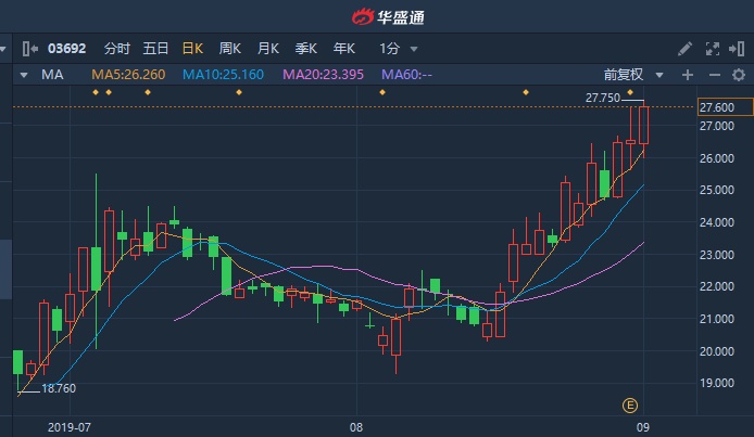 智通财经APP获悉,翰森制药(03692)上周五公布中期业绩,期内收入约人民币45.99亿元,同比增长约21.9%,溢利约12.96亿元,同比增长24.3%。截至发稿,涨3.95%,报27.6%,成交额8751.85万港元。盘中股价高见27.75港元,刷新历史新高。