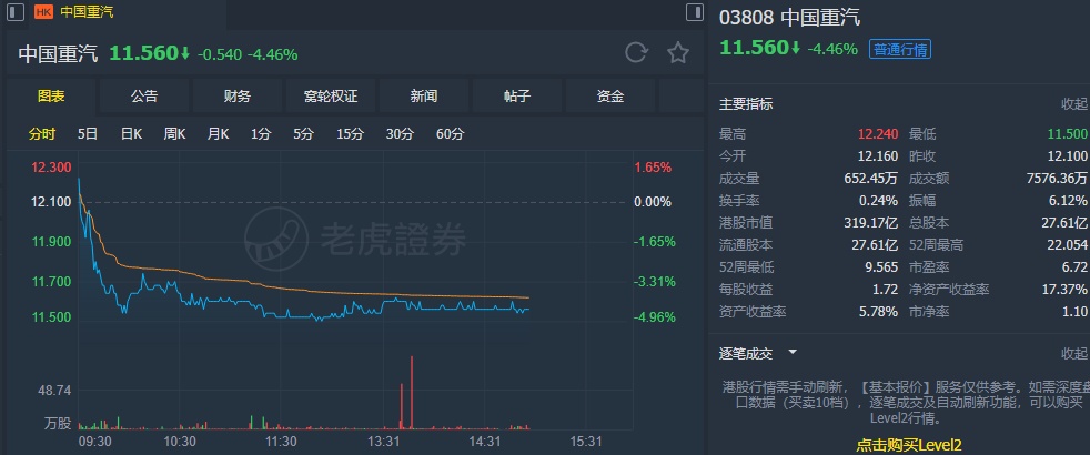 智通财经APP获悉,瑞信发表研究报告称,中国重汽(03808)上半年盈利升3%,主要因为重型货车营运利润率提升2.7个百分点,轻型货车货车和公共汽车分部经营利润率下跌至负1.9%。因应重型货车表现胜预期,升盈利预期1-5%,目标价由11元升至11.6元,评级维持“中性”。