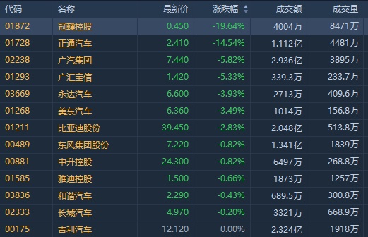 截至发稿,正通汽车(01728)跌14.18%,报2.42港元;广汇宝信(01293)跌4.67%,报1.43港元;永达汽车(03669)跌3.93%,报6.6港元;美东汽车(01268)跌3.19%,报6.38港元;东风集团(00489)跌0.55%,报7.24港元。