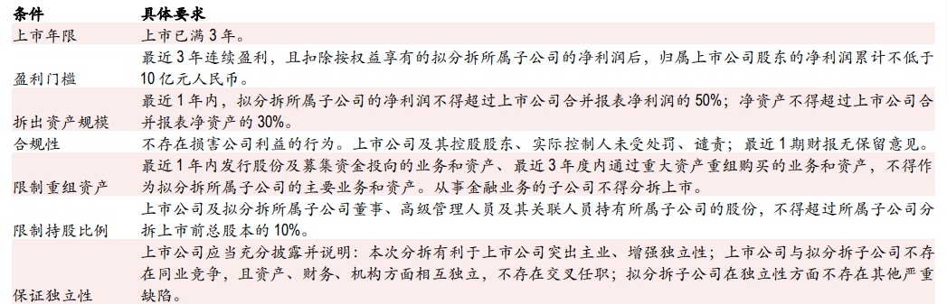表1.境内分拆上市所需满足七项条件