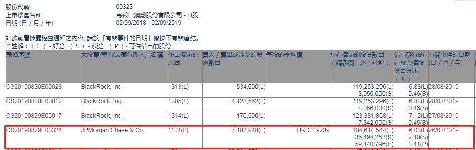 智通财经APP获悉,联交所最新资料显示,8月26日,小摩增持马钢股份(00323)718.39万股,每股作价约2.92港元,总金额约为2097.70万港元。增持后最新持股数目约为1.05亿股,最新持股比例为6.03%。