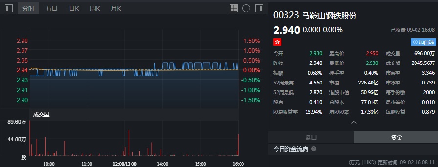 截至今日收盘,马钢股份(00323)股价无涨跌,报2.94港元。