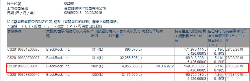 智通财经APP获悉,联交所最新资料显示,8月28日,贝莱德增持金蝶国际(00268)485.6万股,每股作价6.9761港元,总金额约为3387.59万港元。增持后最新持股数目约为1.69亿股,最新持股比例为5.11%。