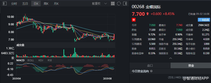 截至今日收盘,金蝶国际(00268)涨8.45%,报7.70港元。