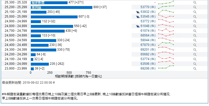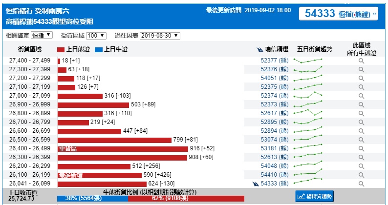 智通财经APP获悉,截至9月2日,恒指最新的牛熊街货比例38:62。瑞信恒指牛熊证街货分布图中的数据显示,熊证街货重货区在26400-26499区间,该区间最新熊证数量为916张,较上一交易日增加52张,最多新增在26100-26199区间。牛证街货重货区在25200-25299区间,该区间最新牛证数量为800张,比上一交易日增加37张;最多新增区间在25300-25328区间。