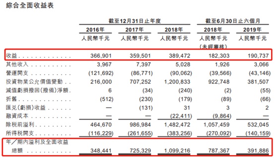 截至2016年、2017年及2018年12月31日止年度各年及截至2019年6月30日止六个月,前身集团产生的收益分别为人民币366.9百万元、人民币359.5百万元、人民币389.5百万元及人民币190.7百万元;溢利及全面收益总额分别为人民币348.4百万元、人民币725.3百万元、人民币1099.2百万元及391.9百万元。