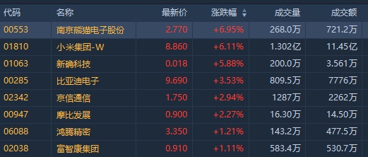 智通财经APP获悉,A股5G概念逆市上扬,港股跟涨。截至发稿,南京熊猫(00553)涨6.95%,报2.77港元;小米集团(01810)涨5.75%,报8.83港元;京信通信(02342)涨2.94%,报1.75港元;比亚迪电子(00285)涨2.88%,报9.63港元。