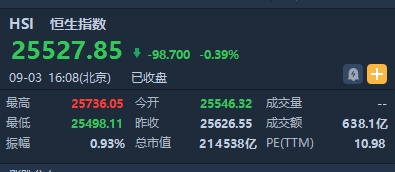 智通财经APP获悉,恒生指数开盘跌0.31%,盘初一度直线拉升,随后全天震荡下跌。截至收盘,恒生指数跌98.7点或0.39%,报25527.85点,全日成交额达638.15亿。国企指数跌0.67%,报10035.78点,红筹指数跌0.94%,报4113.63点。