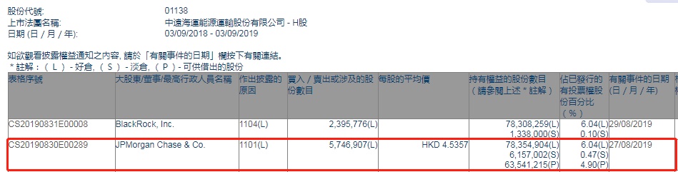 智通财经APP获悉,联交所最新资料显示,8月27日,摩根大通增持中远海能(01138)574.69万股,每股作价4.5357港元,总金额约为2606.62万港元。增持后最新持股数目约为7835.49万股,最新持股比例为6.04%。