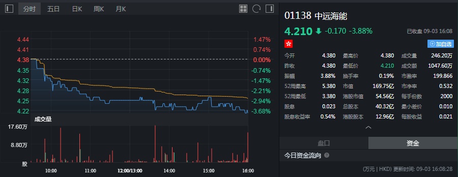 截至今日收盘,中远海能(01138)跌3.88%,报4.21港元。