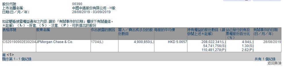 智通财经APP获悉,联交所最新资料显示,8月28日,中国中铁(00390)被摩根大通减持约490.09万股,每股平均价5.0657港元,涉及总金额约为2482.6万港元。减持后摩根大通最新持股数目约为2.08亿股,最新持股比例为4.94%。