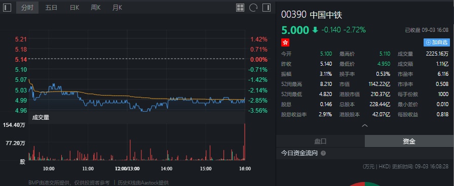 截止今日收盘,中国中铁跌2.72%,报5.00港元。