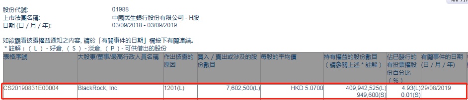 智通财经APP获悉,联交所最新资料显示,8月29日,贝莱德减持民生银行(01988)760.25万股,每股作价5.07港元,总金额约为3854.47万港元。增持后最新持股数目约为4.10亿万股,最新持股比例为4.93%。