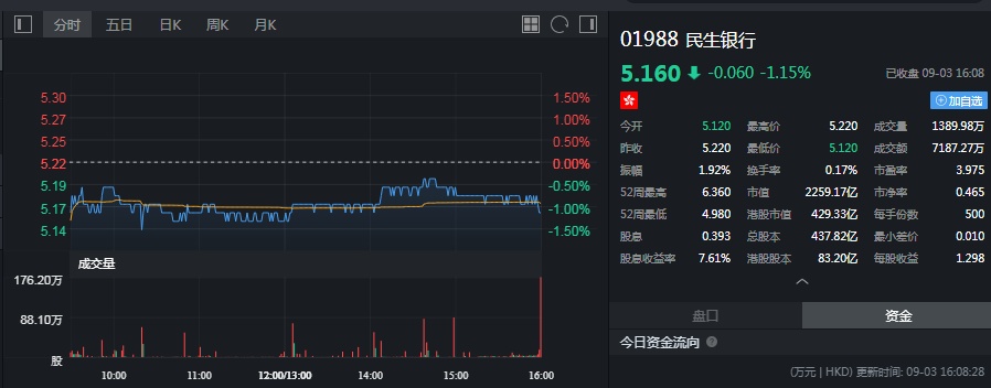 截至今日收盘,民生银行(01988)跌1.15%,报5.16港元。