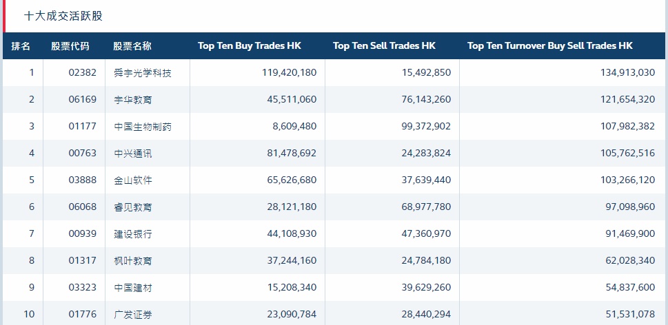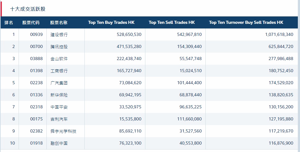 港股通(沪)十大活跃成交股
