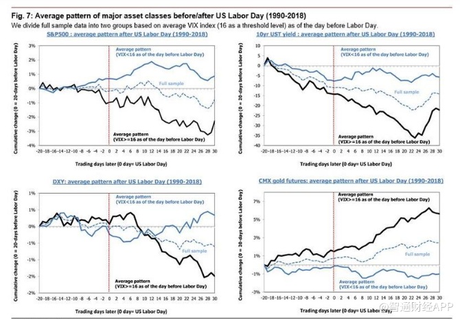 最后,就季节性模式而言,在回顾了1990年以来各种市场指标(美国股票指数、10年期美国国债收益率、Dxy、黄金)在劳动节假期后美股开盘时的表现之后,野村发现,当8月份的平均VIX读数高于16的警告标志水平时(今年实际在19.1),在市场从长期工党返回后,避险势头往往会在多个资产类别中徘徊。