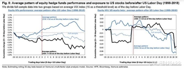 长期/短期基金的历史行为也值得一提。当8月份市场动荡时,多头/空头基金往往会在劳动节前后重新建立其股票敞口,但他们的看涨通常是短暂的。至少,野村证券的量化投资团队认为,投资者应对“对冲基金在劳动节假期后会加速买入股票”这种说法持保留态度。