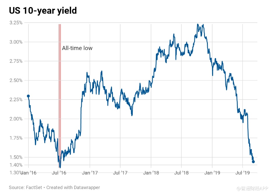 上周三,30年期国债收益率跌至历史低点1.91%,而10年期美国国债收益率月内下降大约50个基点。上一次10年期国债收益率单月内下降约50个基点左右时是在2015年的一月份。