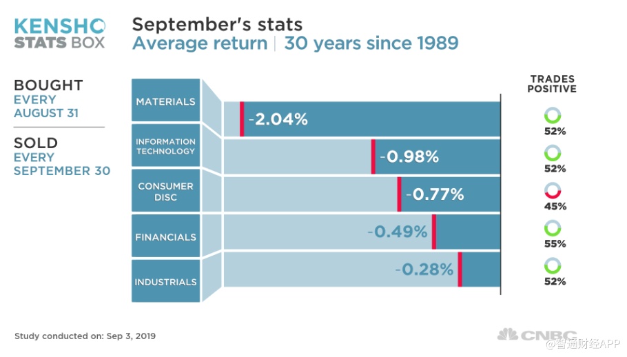 但是,持有材料和科技板块股票的投资者要小心谨慎。9月份材料板块平均下跌2%,而科技股平均下跌近1%。非必需消费品股票(包括亚马逊(AMZN.US)和家得宝(HD.US)) 平均下跌0.8%,另外,9月金融和工业板块小幅下跌。