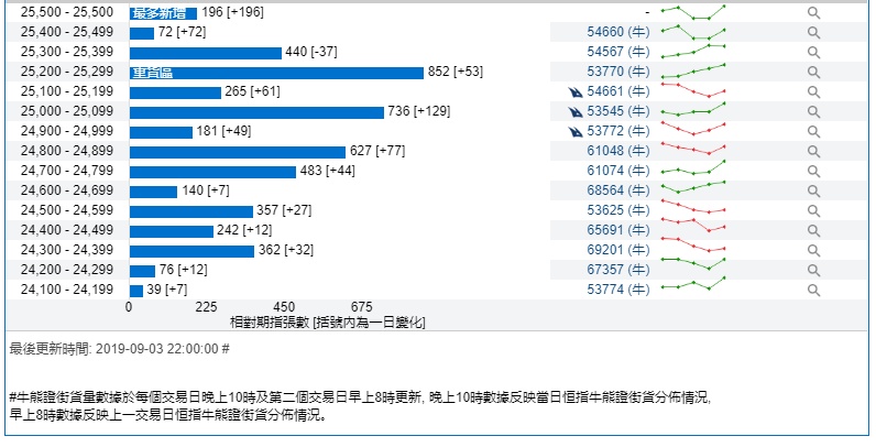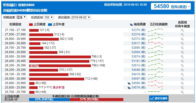 智通财经APP获悉,截至9月3日,恒指最新的牛熊街货比例43:57。瑞信恒指牛熊证街货分布图中的数据显示,熊证街货重货区在26300-26399区间,该区间最新熊证数量为798张,较上一交易日减少109张,最多新增在25800-25899区间。牛证街货重货区在25200-25299区间,该区间最新牛证数量为852张,比上一交易日增加53张;最多新增区间在25500-25500区间。