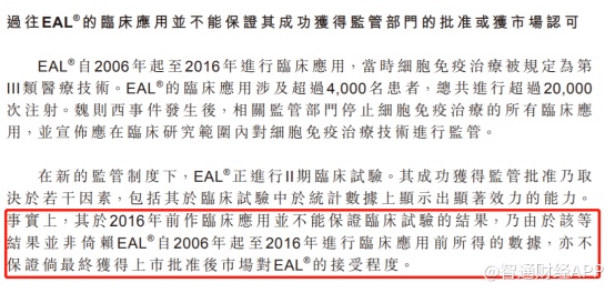 简言之便是,2016年因国内对细胞免疫疗法研究的限制,永泰生物在2016-2019年期间鲜有新的临床试验结果出炉,而其在2016年以前的临床应用或许在最终新药审批时面临不被认可的风险。此外市场对基于此前临床应用的EAL产品是否接受也是一个未知数。