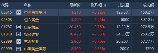 截至发稿,中国白银集团(00815)涨6.09%,报1.22港元;恒兴黄金(02303)涨4.96%,报5.5港元;招金矿业(01818)涨3.35%,报10.5港元;灵宝黄金(03330)涨2.84%,报1.45港元;山东黄金(01787)涨2.26%,报20.35港元。