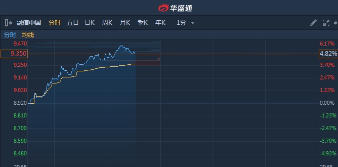 智通财经APP获悉,融信中国(03301)前8个月合约销售额同比增长约7.54%至804.93亿元,此消息刺激股价上扬,盘中一度涨超5%,截至11时31分,涨4.82%,报价9.35港元,成交额1238万。