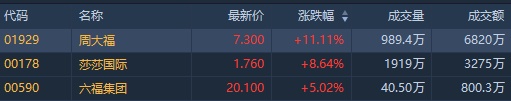 智通财经APP获悉,恒指午后一度涨近千点,香港零售股集体反弹,截至14时25分,周大福(01929)涨11.11%,报价7.3港元,莎莎国际(00178)涨8.64%,六福集团(00590)涨5.02%。