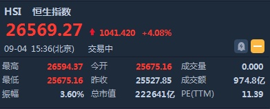 智通财经APP获悉,恒指早盘高开147.31点或0.58%,报25675.16点。午后暴力拉升,一度升逾千点,创去年11月2日以来最大单日涨幅,重回两万六关口,蓝筹股全线上涨,香港地产股集体暴涨,截至收盘,恒生指数涨995.38点或3.9%,报26523.23点,全日成交额达1163.77亿。国企指数涨2.52%,报10288.19点,红筹指数涨2.12%,报4200.86点。