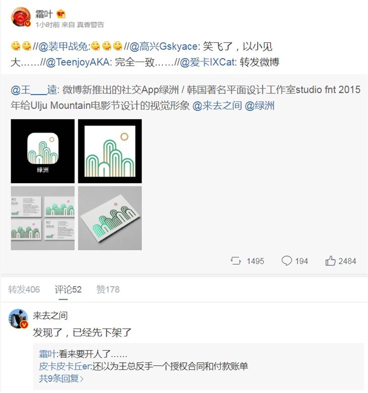 此次“绿洲”在App Store下架,或许与logo涉嫌抄袭有关。微博CEO王高飞“来去之间”在一条关于绿洲App logo涉嫌抄袭韩国平面设计工作室studio fnt 2015年给Ulju Mountain电影节设计的视觉形象的微博下方评论称,“发现了,已经先下架了。”