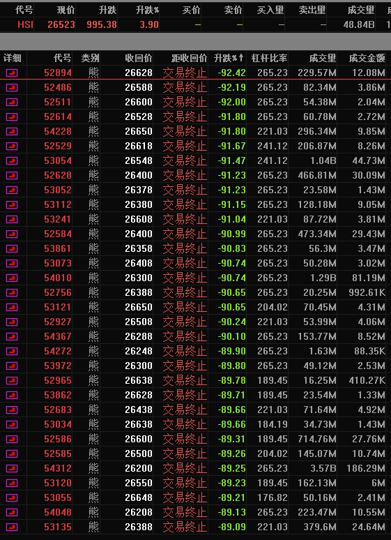 今日港股主力在挟淡仓下,全日有282只熊证遭打靶(取消交易)。“空军”在2个小时内损失惨重。在智通财经APP的《周策略.数据看盘》中已经明确指出,从恒生指数牛熊街货分布情况看,25725指数位置,下方牛证密集期偏离有500点位置,上方熊证密集区偏离度缩小,值得注意的是港股通南下资金,近期明显加大了对港股的低估值布局,恒生指数存在反弹的意愿。