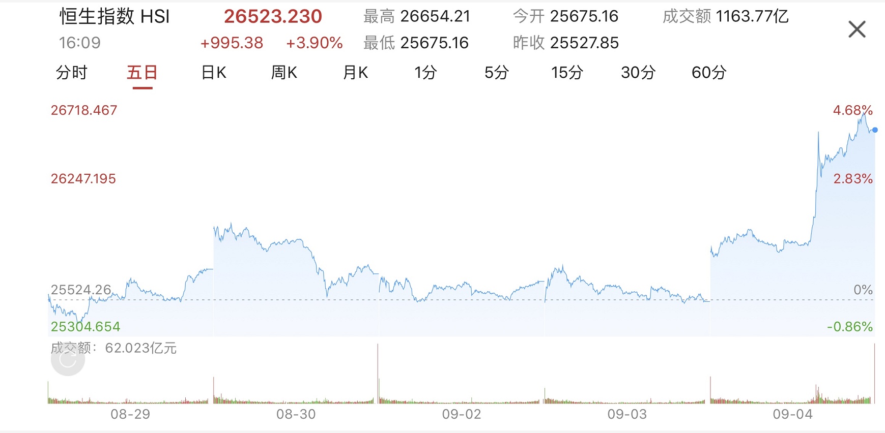 恒指收涨近4%,创去年11月以来最大单日涨幅。腾讯控股收涨逾3.5%,蓝筹地产股全线收高。MSCI香港指数涨幅5.4%,创下2011年以来最大涨幅。而港元汇率更是冲上7.83水平。