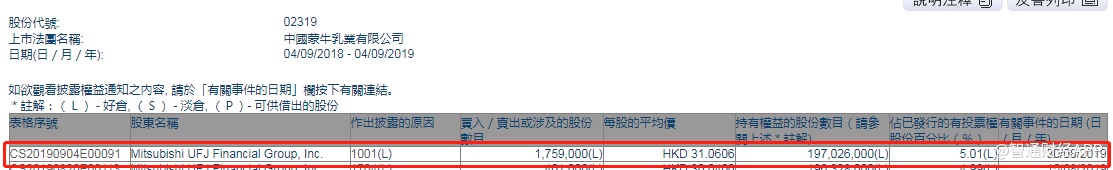 智通财经APP获悉,联交所最新资料显示,8月30日,Mitsubishi UFJ Financial Group增持蒙牛乳业(02319)175.9万股,每股作价31.0606港元,总金额约为5463.6万港元。增持后最新持股数目约为1.97亿股,最新持股比例为5.01%。