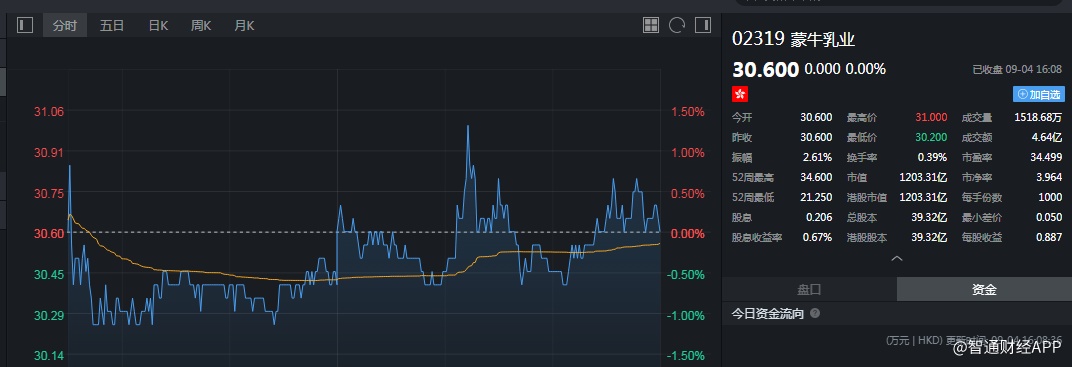 截至今日收盘,蒙牛乳业(02319)无涨跌,报30.6港元。