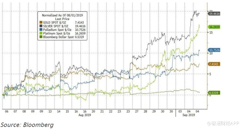 值得注意的是,除黄金和白银外,铂金价格最近升至16个月以来的最高水平,而钯金在触及一个月高点之后又上涨了4.1%。