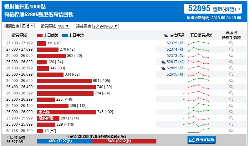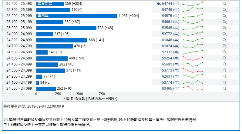 智通财经APP获悉,截至9月4日,恒指最新的牛熊街货比例46:54。瑞信恒指牛熊证街货分布图中的数据显示,熊证街货重货区在26000-26099区间,该区间最新熊证数量为745张,较上一交易日增加32张,最多新增在25900-25999区间。牛证街货重货区在25200-25299区间,该区间最新牛证数量为1057张,比上一交易日增加204张;最多新增区间在25400-25498区间。
