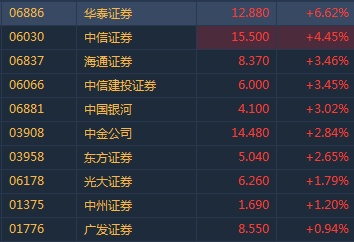 智通财经APP获悉,国常会释放降准预期,中资券商股随A股全线大涨。截至9时33分,华泰证券(06886)涨6.62%,报价12.88港元,中信证券(06030)涨4.45%,海通证券(06837)涨3.46%,中信建投(06066)涨3.45%,中金公司(03908)涨2.84%。
