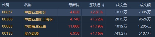 截至发稿,中石油(00857)涨2.56%,报4.01港元;中石化(00386)涨1.93%,报4.75港元;中海油(00883)涨1.19%,报11.88港元。