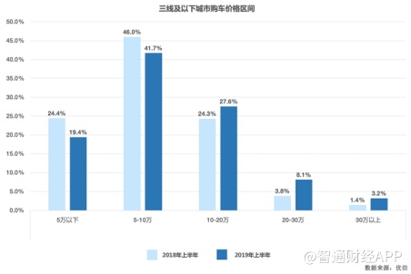 下沉市场消费能力的提升,同样体现在成交价格上。报告显示,上半年三线及以下城市用户购买的车辆中,10-20万区间同比去年上升3.3个百分点,20万以上区间的占比更是比去年同期上升一倍有余,足见下沉市场的“消费升级”初现苗头。