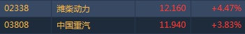 智通财经APP获悉,8月重卡销量同比增长1.6%至7.3万辆,天风证券指销量超市场预期。重卡板块集体走强,截至11时37分,潍柴动力(02338)涨4.47%,报价12.16港元,中国重汽(03808)涨3.83%,报11.94港元。