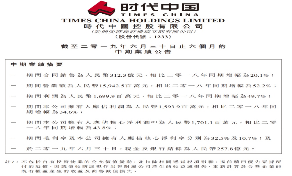 首先从业绩方面来看,2019年上半年,公司合同销售额312.3亿元人民币(单位下同),同比增长20.1%,实现销售面积206.4万平方米,同比增长36.8%。期内,公司实现营业收入159.4亿元,同比增长52.2%,公司拥有人应占利润15.94亿元,同比增长34.6%。时代中国仍是百强房企中业绩增速较快的之一。