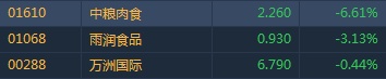 智通财经APP获悉,猪肉概念股集体回撤,中粮肉食(01610)午后跌幅扩大至6.6%,领跌板块。截至14时16分,中粮肉食跌6.61%,报价2.26港元,雨润食品(01068)跌3.13%,万洲国际(00288)跌0.44%。