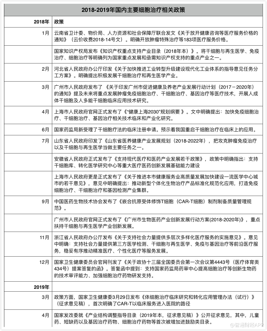 政策方面,自2015年以来,国家对细胞免疫治疗的政策不断完善,其中2018年至2019年利好政策不断涌现(见表),特别是国家卫生健康委3月29日发布《体细胞治疗临床研究和转化应用管理办法(试行)》(征求意见稿),首次明确了CAR-T以临床服务进入医院的路径,是对已有CAR-T药品申报路径的有力补充。
