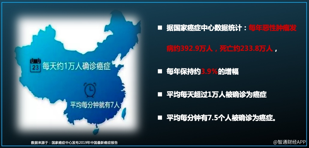 根据世界著名医学期刊《A Cancer Journal for Clinicians》发布的最新的全球癌症统计数据显示, 2018年,全球预计有1810万新发癌症病例,以及960万癌症死亡病例。而中国也未能独善其身。根据2019年1月国家癌症中心发布的报告显示,2015年中国恶性肿瘤发病约392.9万人,死亡约233.8万人。近10多年来,恶性肿瘤发病率每年保持约3.9%的增幅,死亡率每年保持2.5%的增幅。可见癌症已成为严重威胁中国人群健康的主要公共卫生问题之一。